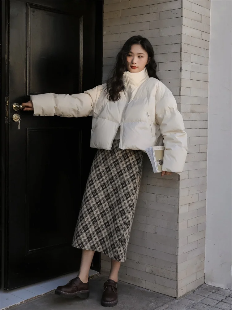 中长款A字格纹裙对大多数身材都很友好,搭配短款羽绒服和打底裤,温暖不显臃肿。