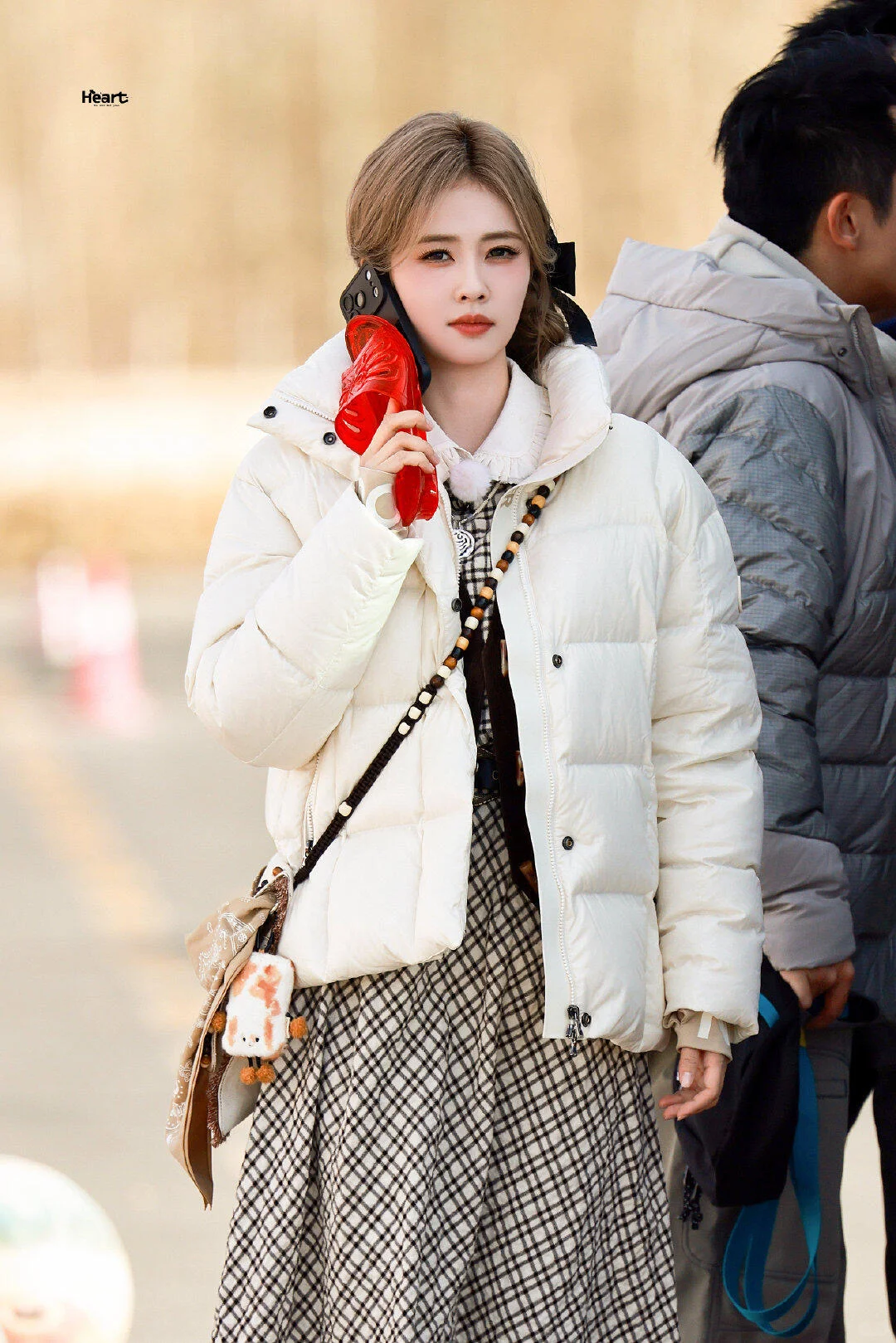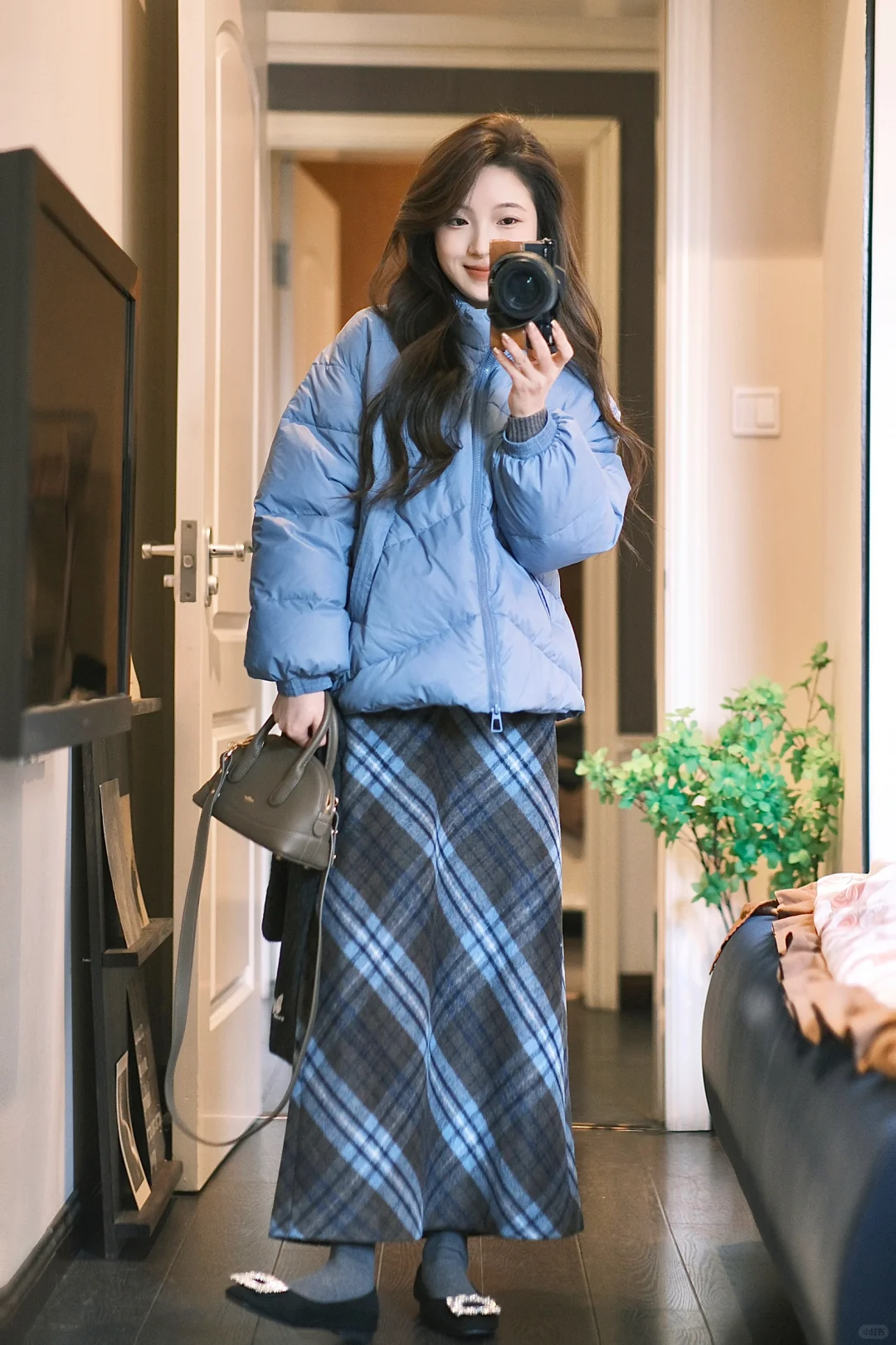 羽绒服+格子裙