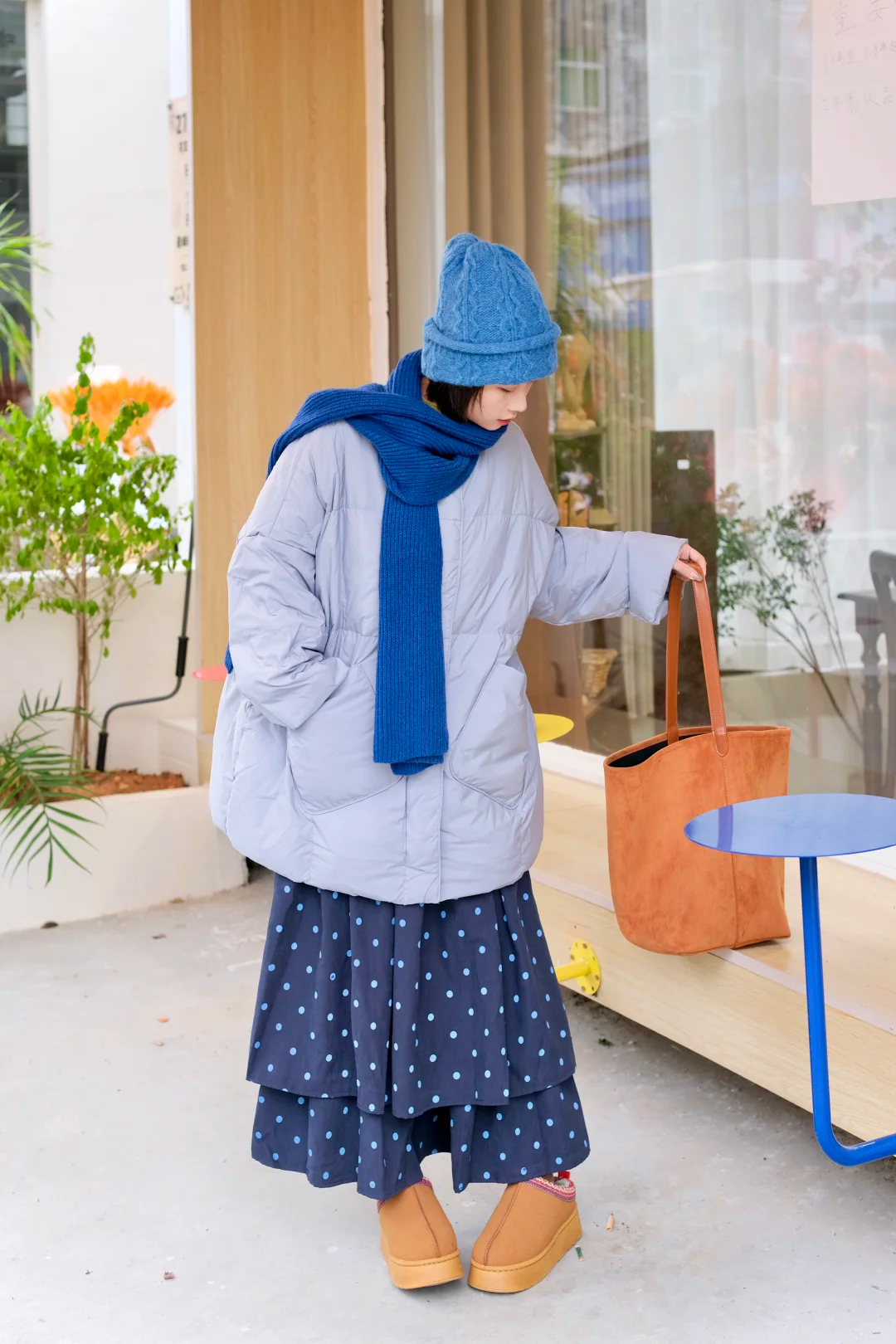 波点自带的复古俏皮感,恰好能中和羽绒服的厚重,让整体造型瞬间轻盈起来。