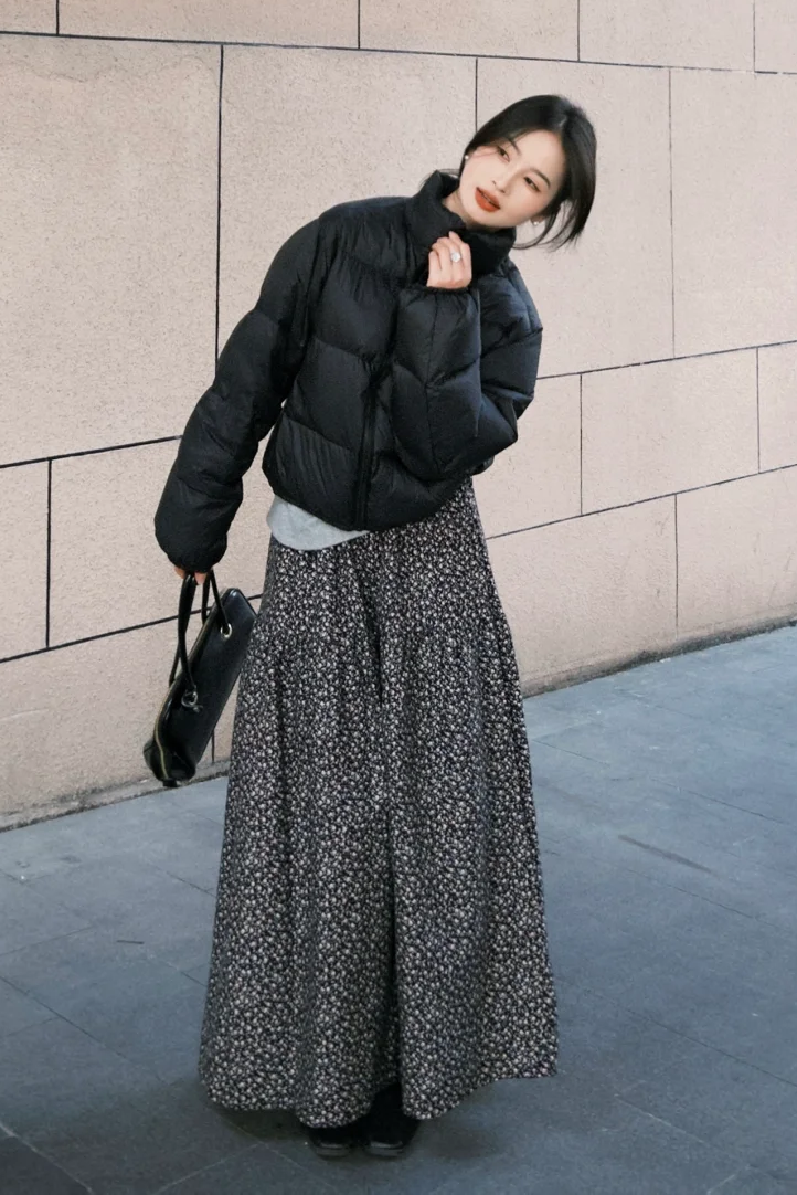 羽绒服款式简单,正好需要一点花样来平衡。碎花、格纹、几何图案的裙装,能瞬间点亮整体造型,让厚重的羽绒服都变得轻盈起来。