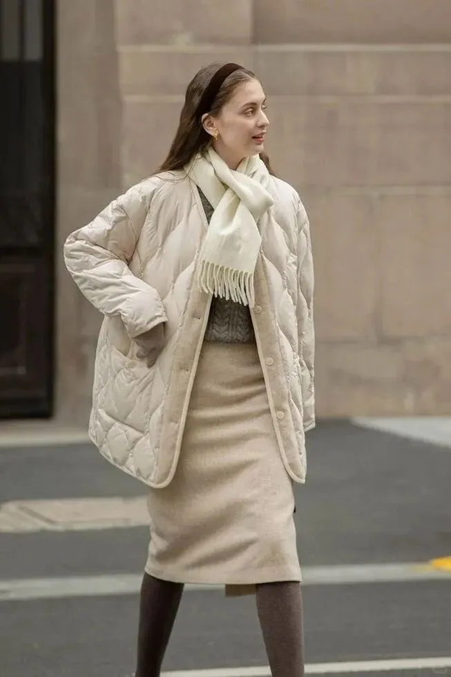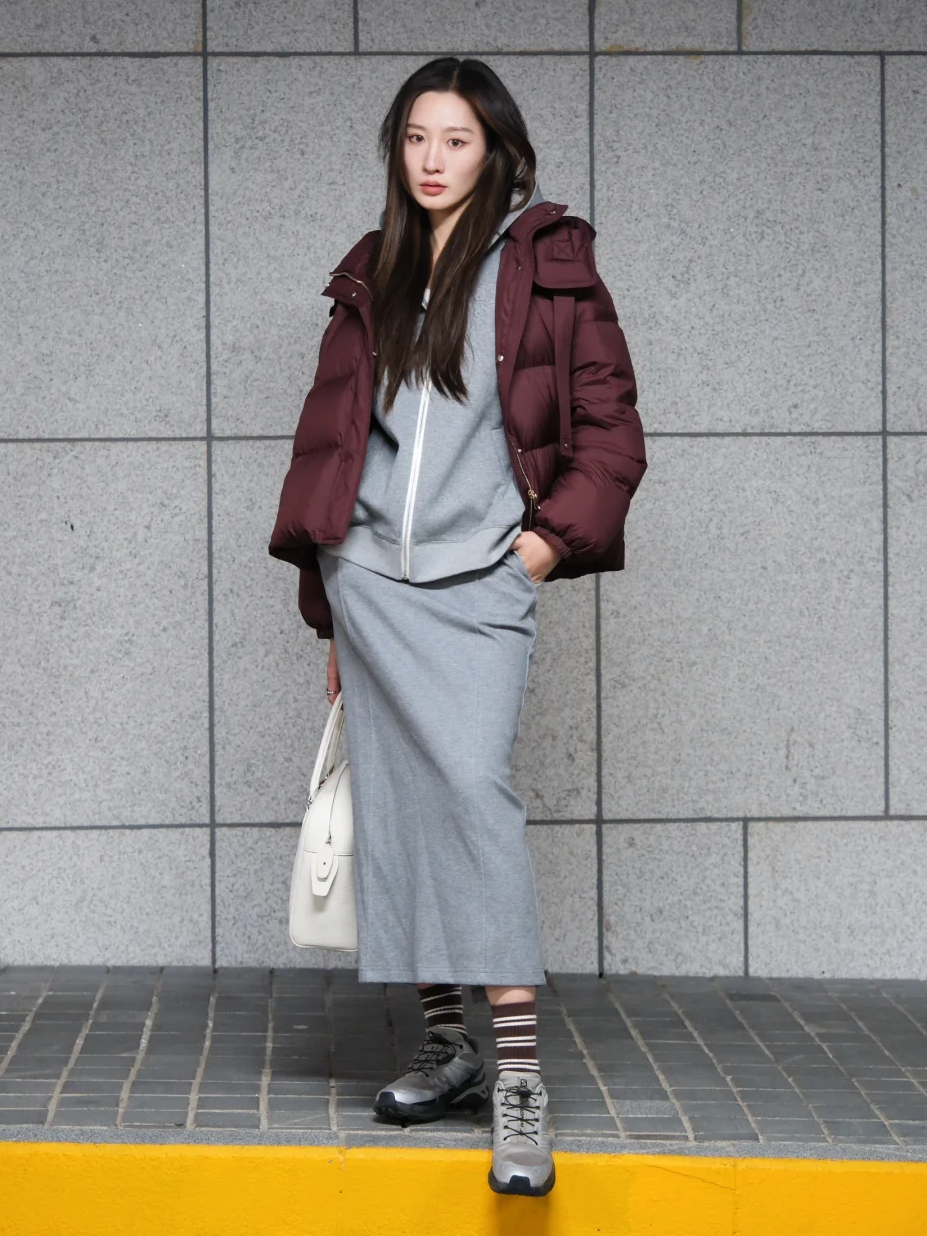 如果选择了宽松的羽绒服,那么裙子最好选择直筒或稍微修身的款式,避免整体看起来过于臃肿。