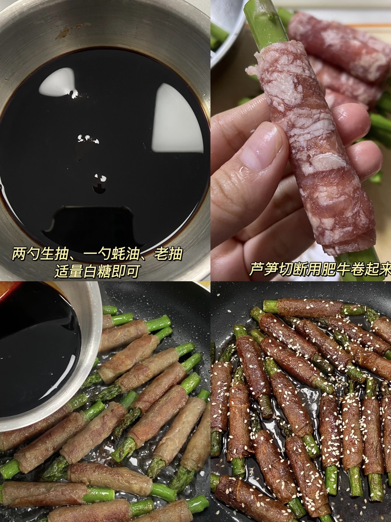 平底锅刷一层薄油,火苗开到中小火,把肥牛卷接口朝下排好队,像听口令的小士兵。30秒后底部定型,轻轻翻面,让肥牛四面都穿上“焦糖色卫衣”。整个过程不超过两分钟,肉片从红变褐,油脂被逼出来,奶香混着芦笋的清甜,像把春天按在锅里煎。倒入剩下的一半酱汁,盖盖子小火焖1分钟,开盖转大火收汁,汤汁咕嘟冒泡,肥牛表面泛起玻璃芡,立刻关火,撒一把熟白芝麻,颜值瞬间拉满。