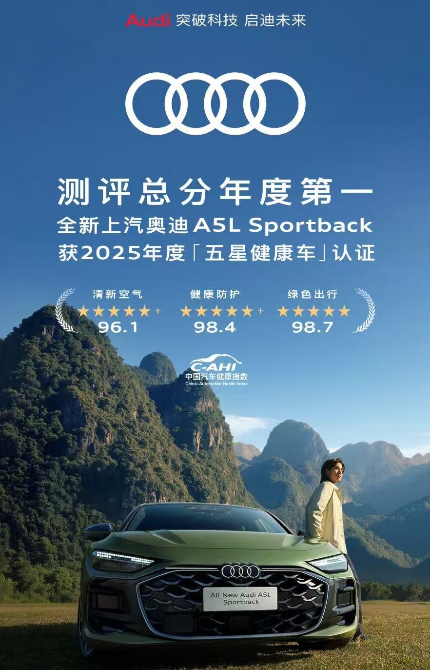 近日,中国汽车工程研究院发布2025年度C-AHI中国汽车健康指数测评结果,全新上汽奥迪A5L Sportback以总分第一的成绩登顶年度榜单,荣获“五星健康车”称号。