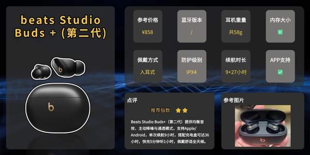 Beats在耳机市场以潮流设计和强劲音效闻名,技术研发在均衡音质和主动降噪功能上有积累。Studio Buds+在Beats产品线中属于中高端真无线耳机,主打均衡音效、降噪体验和全天佩戴舒适度。