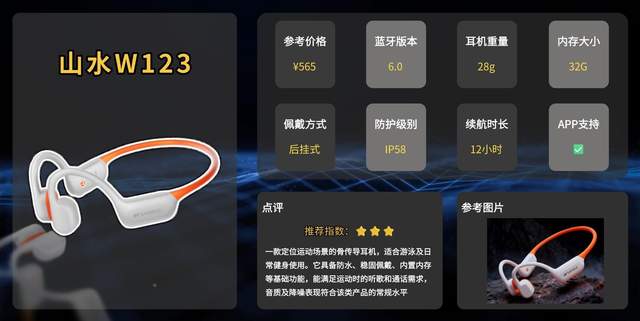山水W123主打专业运动场景,尤其针对游泳等水上运动做了重点优化,核心亮点集中在强防水、稳固佩戴和实用的音频技术上,面向有水上运动及日常健身需求的用户。