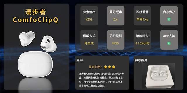 漫步者在耳机市场以高性价比和丰富功能见长,运动耳机技术方面也有一定研发积累。ComfoClipQ在漫步者产品线中属于轻量智能型耳机,主打便携、办公与日常使用的智能功能。