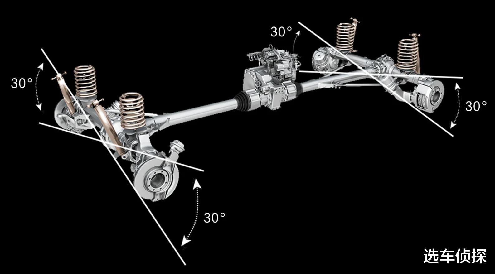 这种结构允许车桥整体实现30° 的摆动角,而传动系统仍保持稳定工作。这意味着,真正发生大幅度运动的是车桥,而不是车架本体。同时,封闭式扭矩管配合高位进气与密封通气系统,涉水深度可达1200 mm。