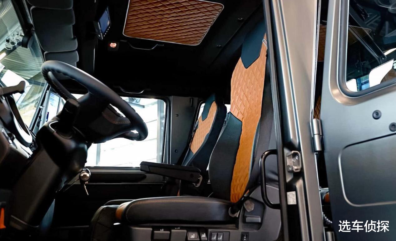 80周年版则反其道而行。在保留原本机械架构的前提下,基于U 4023打造,首次融入豪华配置,比如定制的真皮座椅与内饰包覆,LED氛围灯,更多的隔振、隔音处理,以及双排座布局,动力系统也由原先的四缸发动机升级为OM 936六缸柴油发动机,功率提升至300马力,适合全家人外出旅游。