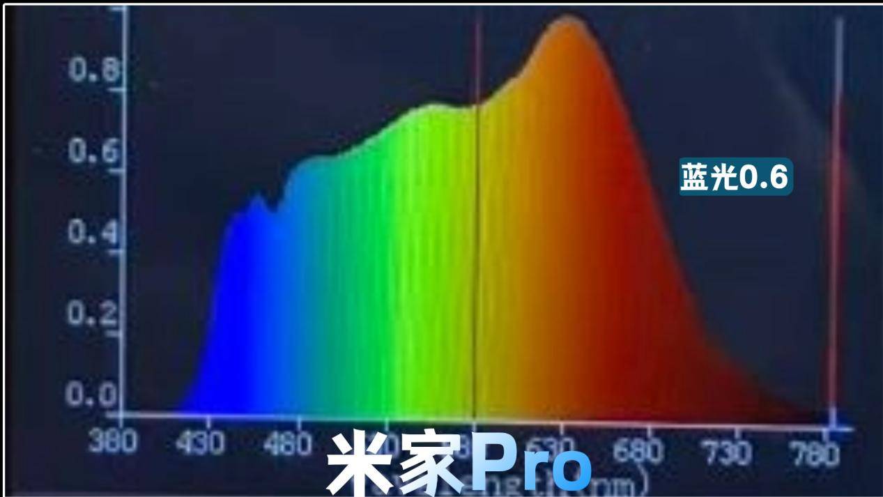 米家是一款采用蓝光激发全光谱的护眼灯,实际蓝光峰值在0.6左右,整体的光谱连续性不错,不过比较遗憾的是,光谱中并没有添加红光,相比有红光增益的护眼灯来说,在还原自然光以及护眼效果上还是存在于一定的区别的。