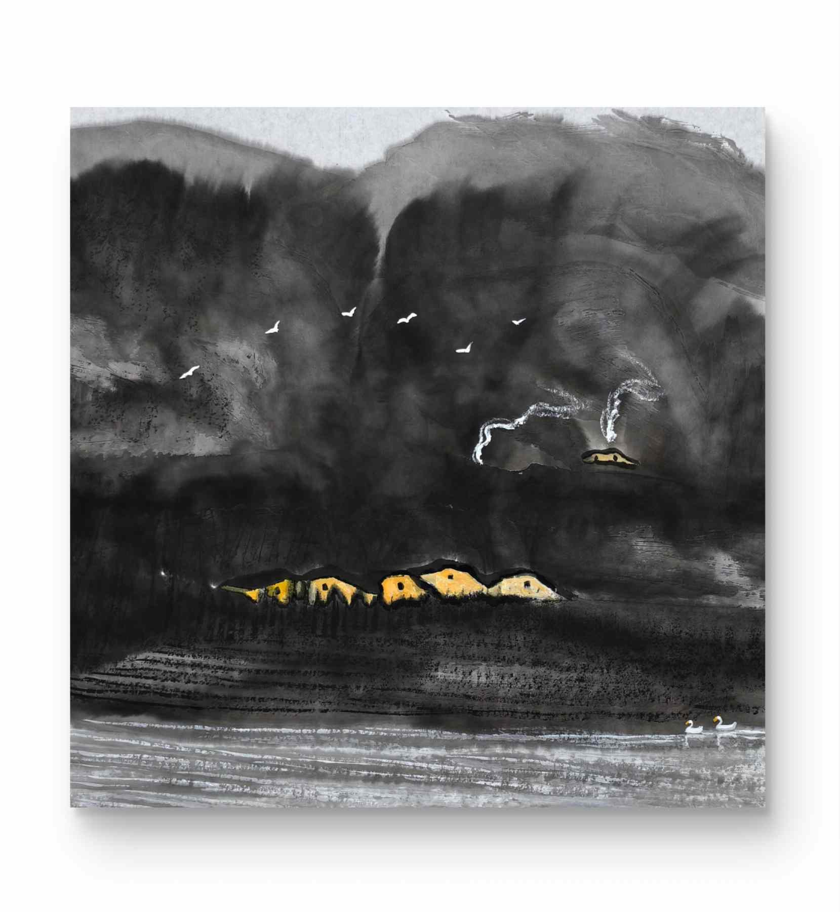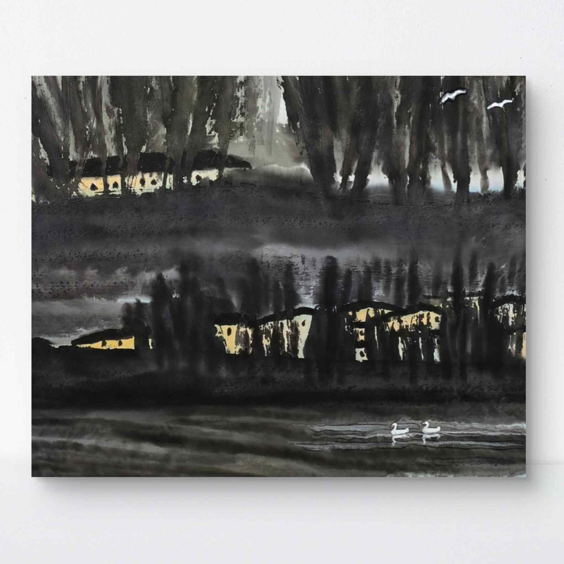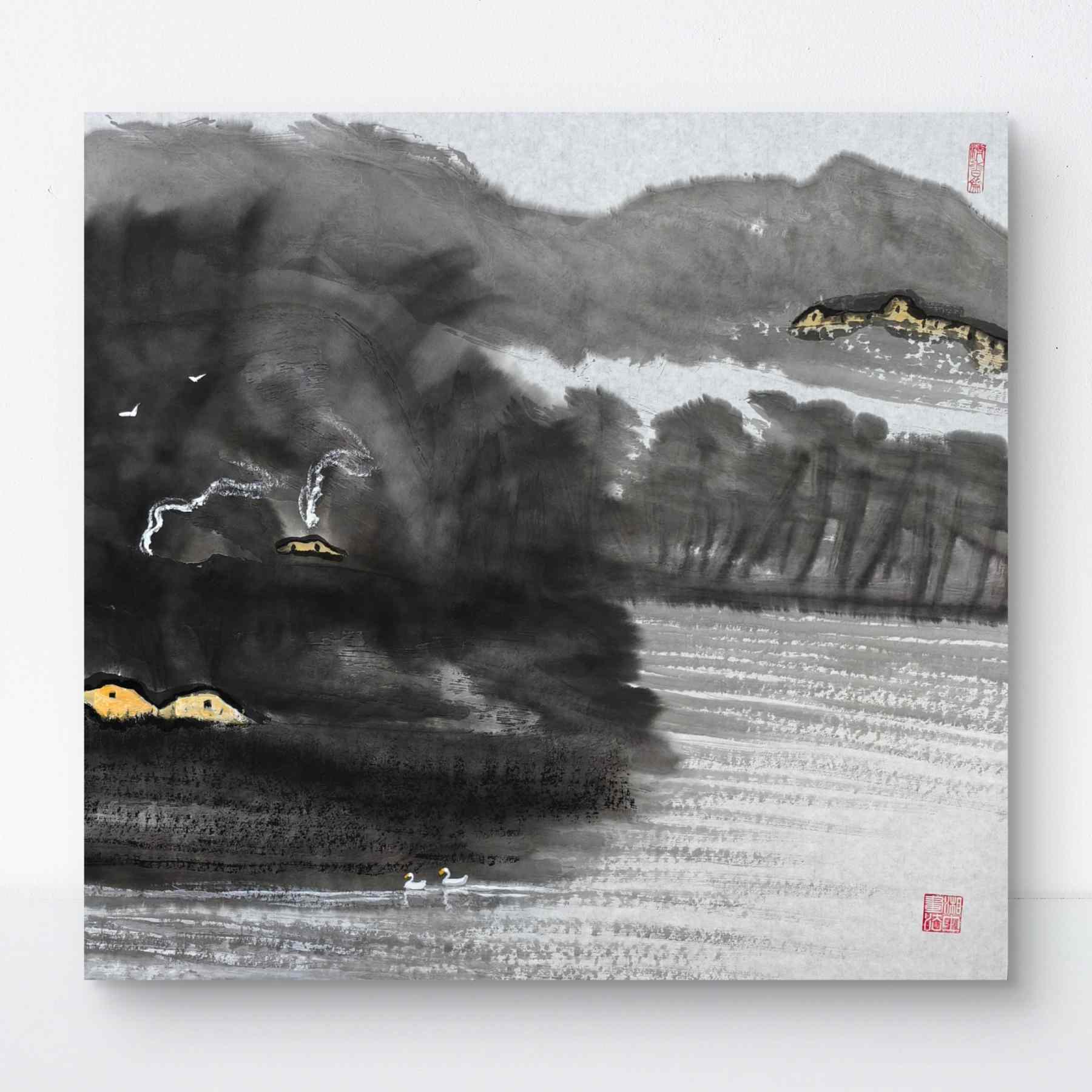 余和平的艺术理念“我自用我法”,彰显了一种强烈的学术自觉。作为军旅画家,他的笔墨中暗含刚健之气,构图大气磅礴,用笔果断有力,这种特质使其作品在柔美的乡土意境中不失精神张力。他师从王阔海、周小愚等名家,深谙传统笔墨精髓,却并未止步于对古法的继承。在清华大学美术学院的进修经历,使其能够以现代审美视角重新审视传统,将大块面的墨色晕染与精细的局部刻画相结合,形成“泼墨皴写意”的独特技法。这种技法打破了传统山水画“以线造型”的单一模式,通过墨色的浓淡干湿与留白的虚实相生,在二维平面上构建出三维的视觉深度。余和平的作品在淋漓酣畅间暗含精微,于水墨氤氲处尽显丘壑峥嵘,实现了笔墨语言从传统到当代的创造性转化。