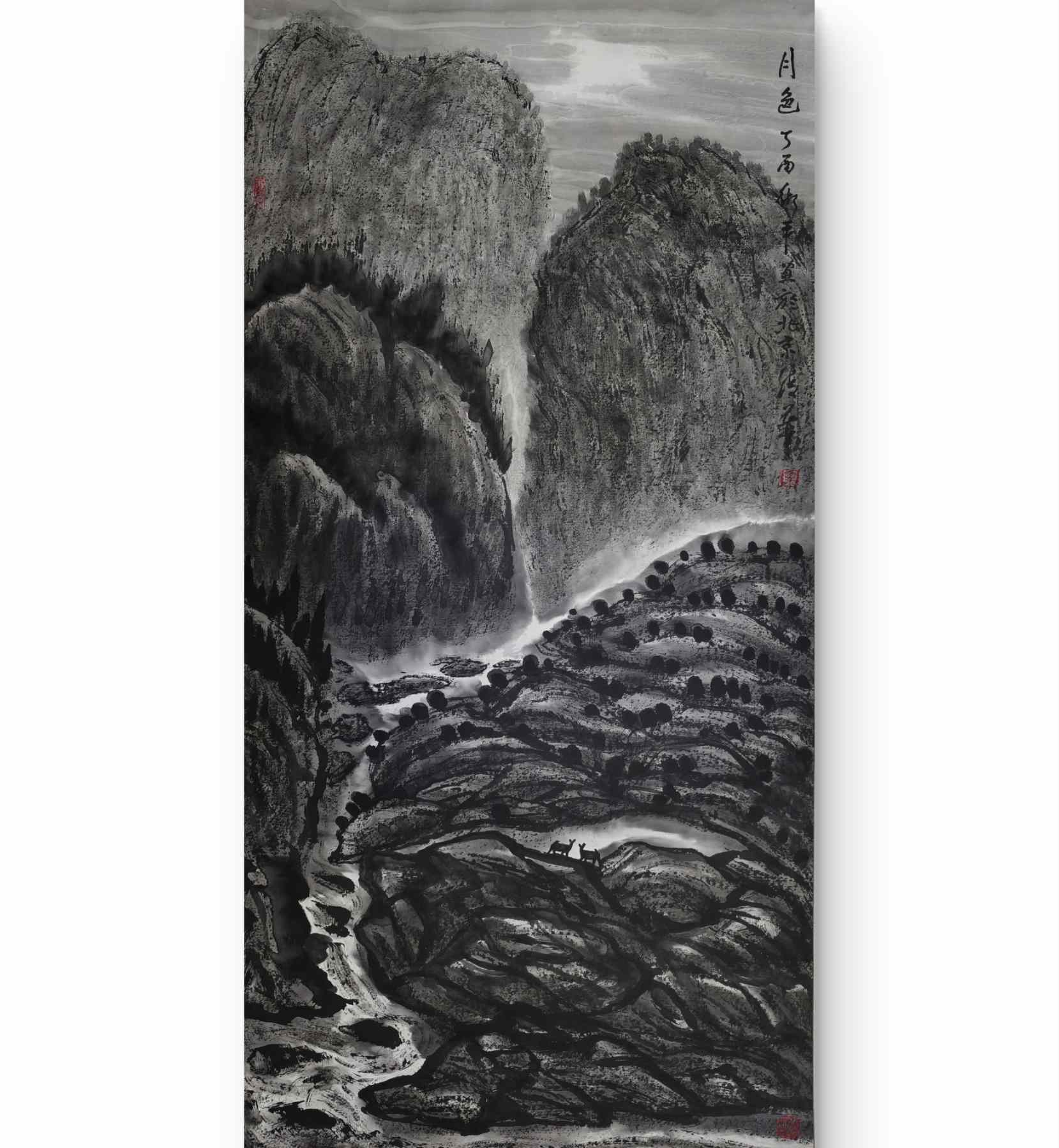 余和平的创作母题高度聚焦于浏阳河与大围山,这两处地理标识不仅是其乡土情结的载体,更是其艺术语言的生成场域。与传统山水画中程式化的“南北宗”图式不同,余和平笔下的湘东山水呈现出一种原生态的质朴与灵秀。他通过对湘土地质肌理的深入观察,将大围山的苍茫雄浑与浏阳河的蜿蜒灵动转化为独特的视觉符号。在创作中,山体的轮廓不再依赖传统的披麻皴或斧劈皴,而是以饱含水分的泼墨技法,结合腕力提按的韵律变化,在宣纸上形成斑驳润染的肌理效果。这种“湘土画法”既保留了水墨的氤氲气韵,又精准捕捉了湘东地区特有的湿润气候与植被覆盖,使画面在抽象与具象之间达成微妙平衡,实现了地域美学的视觉重构。