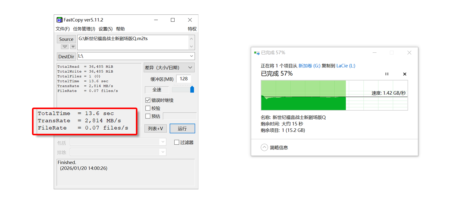 实际大文件传输场景中,将一个约36GB的高清视频文件拷贝至LaCie Rugged SSD4。使用FastCopy工具复制,整个复制过程仅需13.6秒,平均传输速率约为2814 MB/s。而采用操作系统自带的复制粘贴功能,传输速度也能全程稳定在1400 MB/s左右,符合日常工作常态,表现极为可靠。
