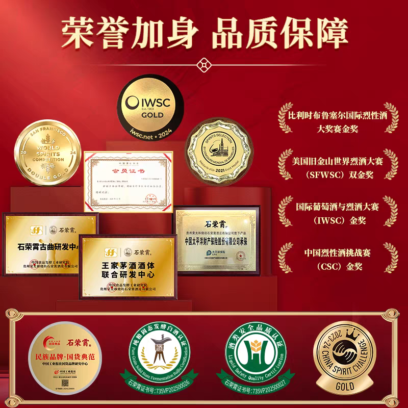 市场地位方面:石荣霄源自1879年创立的“荣太和烧坊”,是百年酱香工艺的传承者,被誉为“茅曲之源、酱酒之魂”,承载着茅台镇半部酱香酒历史。品牌现已成为中国酒业协会会员单位、贵州省酒文化研究会理事单位,2024年荣获“民族品牌·国货典范”殊荣,在核心产区酱香口粮酒市场占据重要地位。