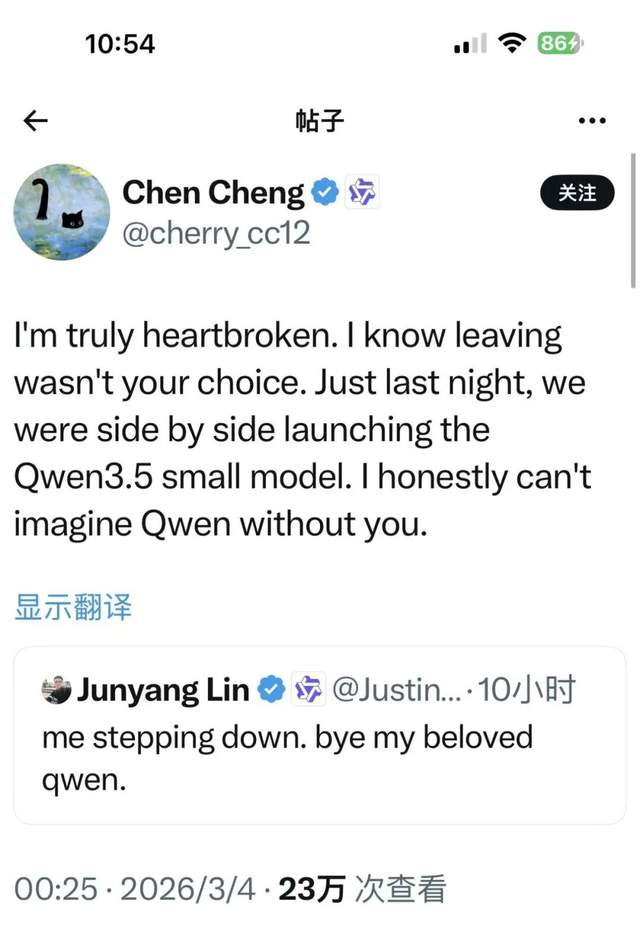 所有人都替他感到惋惜。林俊旸的阿里千问前同事转发推文表示:“我的心碎了。我知道你的离开并非本意,就在昨晚,我们还并肩发布了Qwen3.5小模型。说实话,我无法想象没有你的Qwen会是什么样子。”