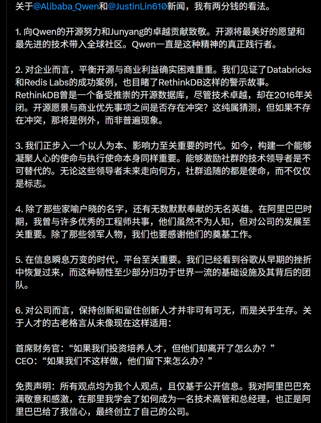 同时,贾扬清抛出一个问题:“开源愿景与商业优先事项之间是否存在冲突?”这似乎暗示了林俊旸离职的某些因素。不过贾扬清强调,这纯属猜测。