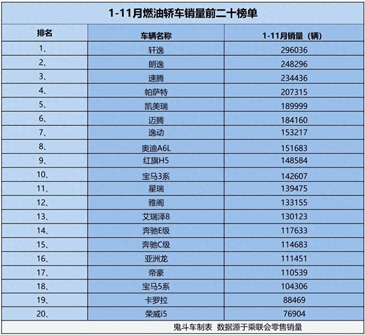 第6名是迈腾,销量184160辆,较第5名凯美瑞少5839辆。第7名是逸动,销量153217辆,较第8名奥迪 A6L(151683辆)的销量多约1.0%。第9名是红旗H5,销量148584辆,较第10名宝马3系(142607辆)的销量多约4.2%。