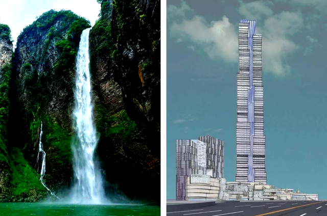 塔楼外表如被“河谷”切割,配合玻璃幕墙与LED照明系统,在夜间营造出瀑布倾泻的动感,实现“高山流水”的诗意表达。