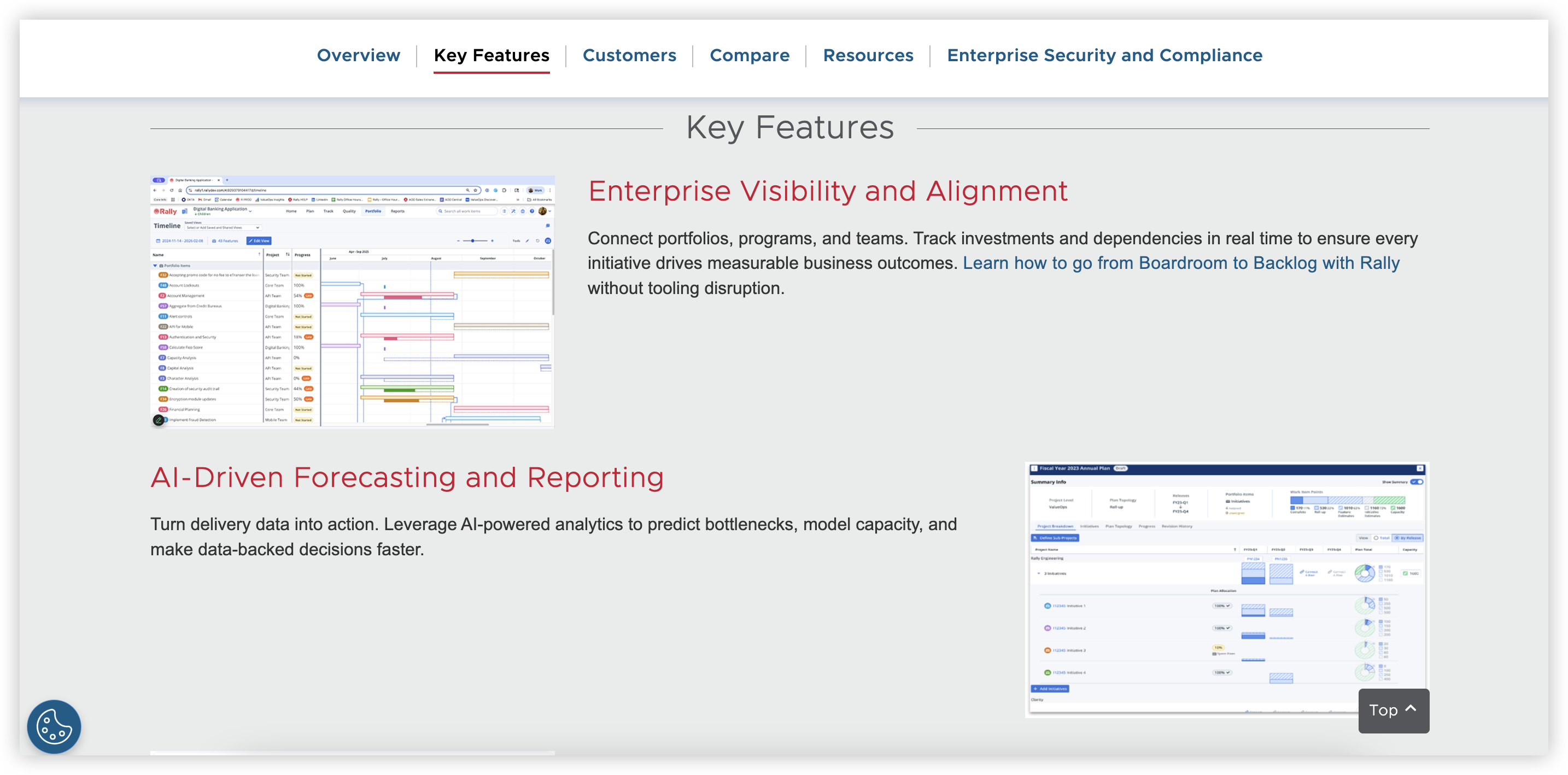 核心定位:Rally 官方强调“从投资决策到交付的完整可追溯性”,并作为 ValueOps 平台的一部分与其他产品集成、支持规模化。