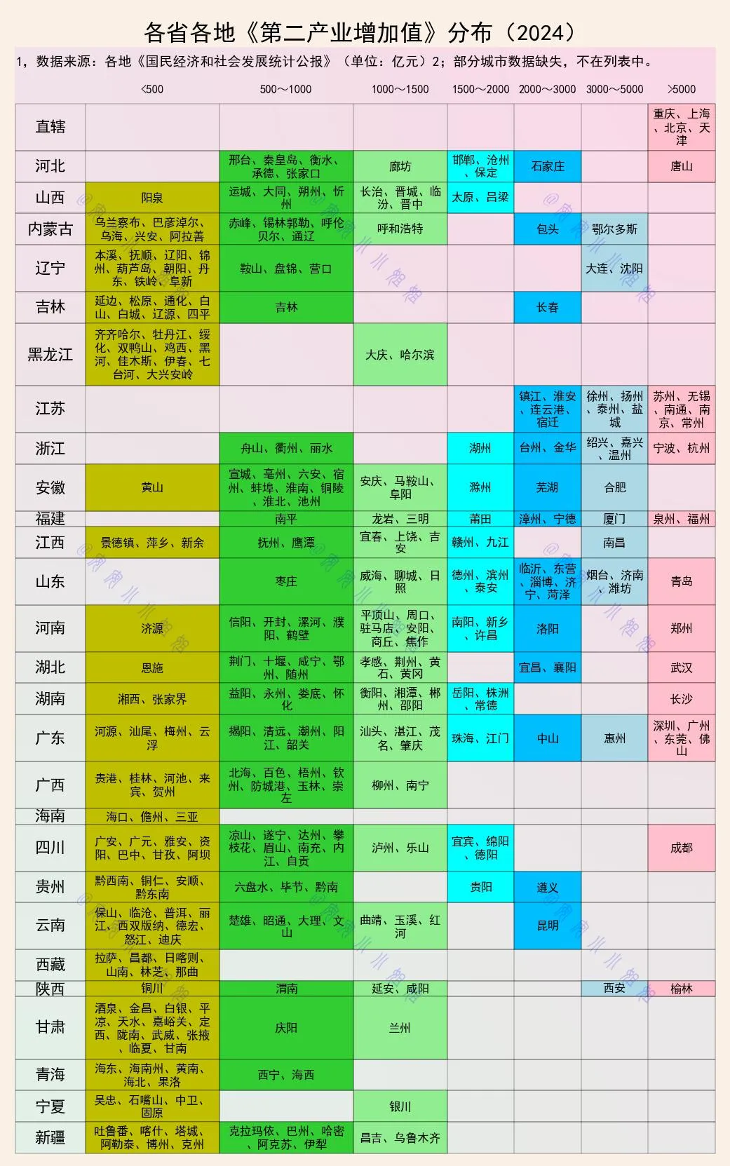 这张名为《各省各地<第二产业增加值>分布(2024)》的图表,为我们揭示了2024年中国各地区工业经济的核心指标之一——第二产业增加值的量化面貌,帮助我们理解不同城市在国家工业化进程中的贡献与位置。