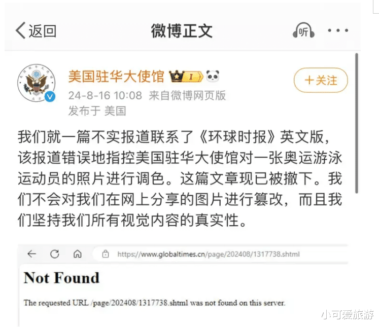 美国驻华大使馆又发布了一篇文章,表示我们就一篇不实报道,联系了《环球时报》英文版,该报道错误的指控,美国驻华大使馆对一张奥运游泳运动员的照片进行调色,这篇文章已经被撤下,我们不会对我们在网上分享的图片进行篡改,而且我们坚持所有的视觉内容的真实性。
