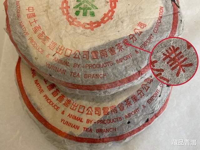 94事业熟饼7572沿用传统云南七子饼包装,“七”字采用大七印刷工艺,八中茶商标的“茶”字为手工盖印,每饼的盖印位置、油墨深浅均有差异,也是辨别其真伪的重要依据之一。
