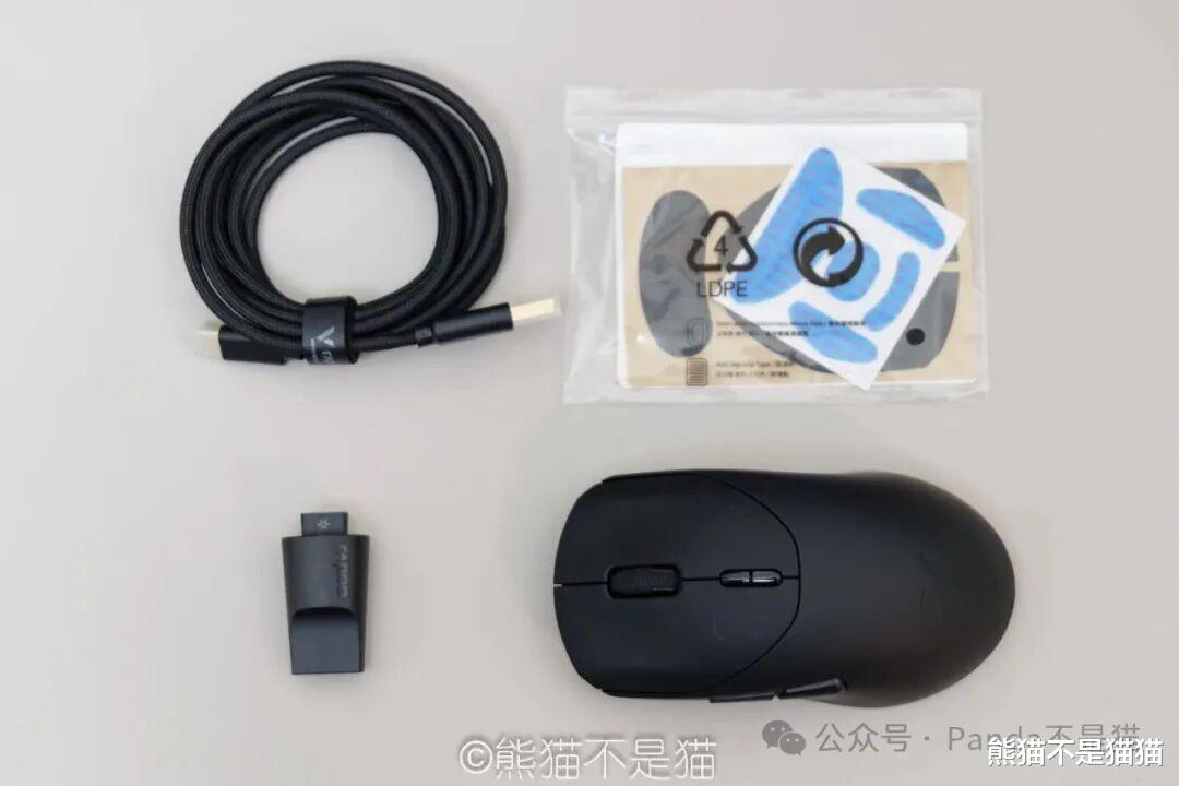 包装依然是VT系列标志性的镭射包装以及雷柏的V型LOGO,打开包装取出所有物品,除了鼠标本体,还提供了按键防滑贴、替换脚贴、Type-C 数据线、USB转接器及8K接收器以及说明书,在配件方面标准版和Max没有区别。