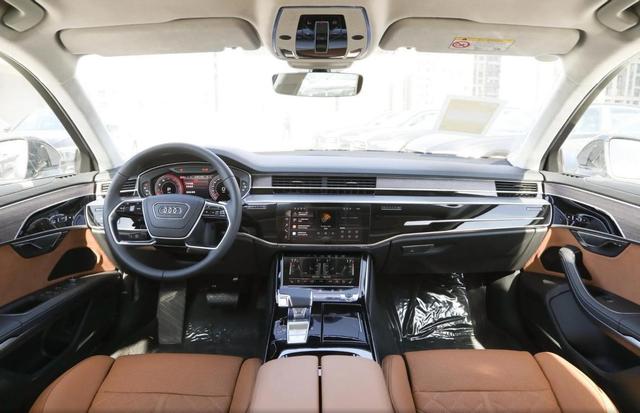 坐进车内,A8L的内饰以环抱式设计为主,大量使用实木饰板和皮质包裹,中控台布局简洁,物理按键阻尼感出色,营造出沉稳的豪华氛围,但车机系统略显陈旧,操作流畅度和功能丰富度一般。