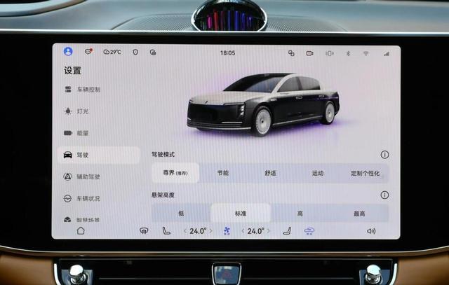 尊界S800分纯电和增程版,此次体验的是增程三电机版本,最大功率635kW,零百加速4.7秒,动力储备充沛,高速超车毫无压力。底盘搭载途灵龙行智能数字底盘,前双叉臂后五连杆+双腔空气悬架,支持预感知路况调节悬架,经过颠簸路面时,冲击力比A8L减少约50%,舒适性更优。新增的“尊界模式”以后排舒适为核心,通过调节阻尼、转向灵敏度等,使晕车感降低60%,这对商务用户很友好。