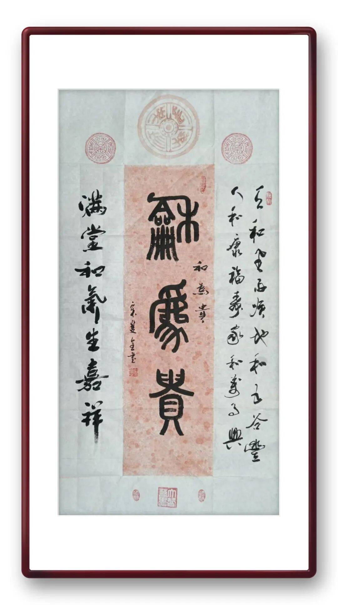 宋双全老师的书法艺术,不止于行草的灵动奔放,更得益于隶篆的深厚滋养。隶篆是中国书法的源头书体,篆书重中锋婉转、圆融庄重,隶书讲蚕头燕尾、舒展大气,二者虽风格迥异,却都是锤炼笔墨功力、涵养气韵风骨的根基。宋老师深谙此道,数十年间,始终坚持研习隶篆,从石鼓文、小篆到汉隶碑帖,逐一临摹,悉心体悟,在隶篆的笔墨锤炼中,夯实了线条的把控能力,涵养了书法的雄浑气度。他的篆书作品,线条圆润流畅,中锋用笔贯穿始终,字形规整对称,疏密均匀,既有大篆的古朴厚重,又有小篆的精致典雅,如绳绕珠联,气脉贯通,尽显“玉箸篆”的庄重与含蓄。其隶书作品,则摒弃了汉隶的繁复冗余,融入了自身的艺术理解,笔画舒展大气,蚕头燕尾分明,结构扁方匀称,疏密有致,既保留了汉隶的古朴厚重,又增添了几分灵动洒脱,打破了隶篆书法“古板呆滞”的刻板印象,使隶篆作品既有传统韵味,又有时代气息。