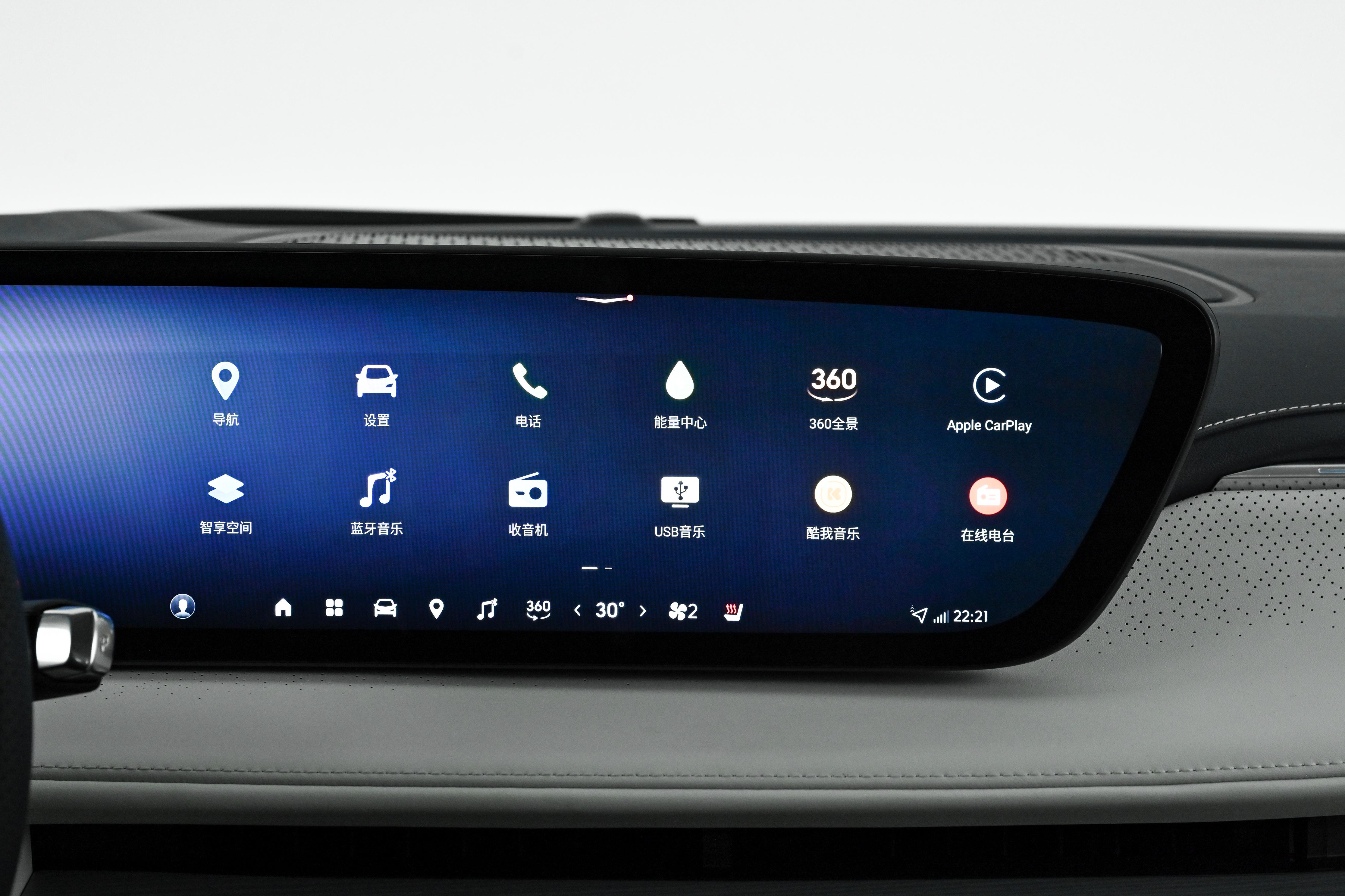 别克GL8 PHEV的内饰采用了环抱式的设计布局,中控台上层次分明,以实用为主,车厢内大面积的软性材质以及皮质包覆提升了一定的档次感,中控台上配备了一块30英寸的一体式大联屏,左边为仪表盘显示区,右边为中控操作区,配备了eConnect车载智能系统,内置了高通骁龙8155车载智能芯片,支持手机App远程控制、百度地图导航、蓝牙/车载电话、CarPlay、车联网、OTA升级、语音识别控制系统、Wi-Fi热点以及应用商店拓展等功能,丰富的智能化表现能够提升日常驾驶的便利性。四幅式的多功能方向盘大小适中,支持上线前后四向调节功能,并带有加热功能,换挡形式为电子式怀挡,并在前排中央扶手处配备了当下流行的手机无线充电功能。