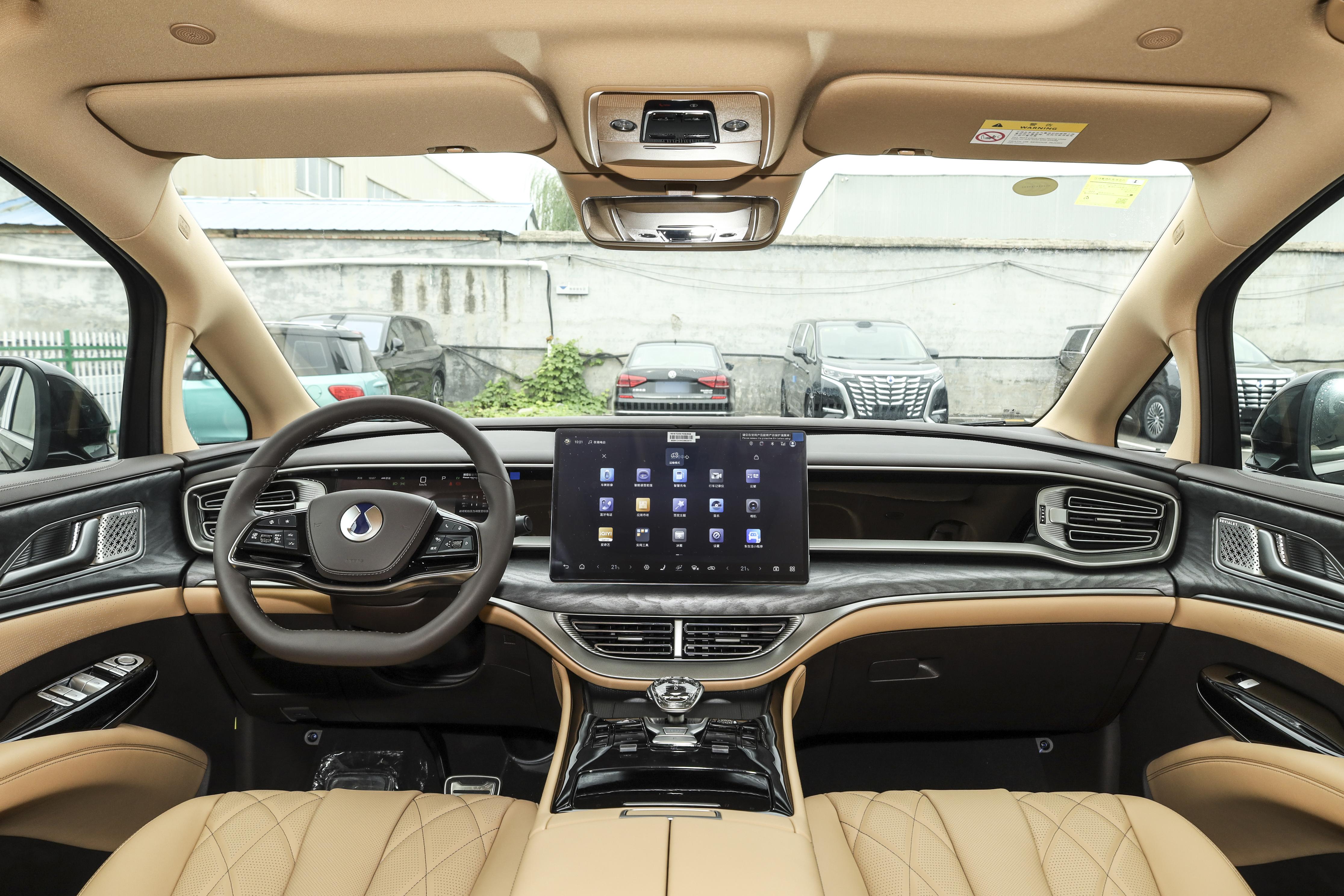 腾势D9 DM的内饰同样采用的是环抱式的设计布局,车厢内各种材质的拼接突显出一定的豪华氛围感,两幅式的多功能方向盘造型时尚美观,采用皮质的材质,支持上下前后四向调节,换挡形式为电子挡把,手机无线充电功能也并未缺席,10.25英寸的全液晶仪表盘+15.6英寸的中控屏属于常规的操作,搭载了DLink车载智能系统,智能化表现基本上是和别克GL8 PHEV保持在同一个水平,但是多出了二三排语音唤醒识别功能,能够让后排的乘客轻松与车机交互,并且这套系统的语音识别功能比较好用,可以识别各地方的方言,并且在多指令条件下的反应速度也是比较快的。