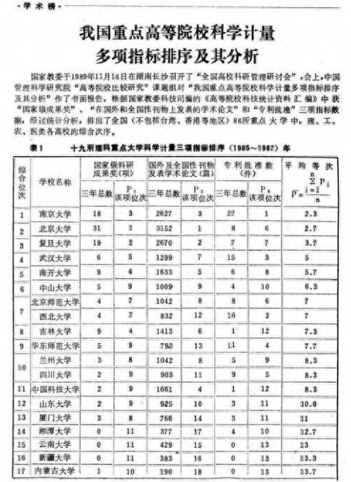 在这次排名里面西北大学根据国际级科研成果奖、国外及全国性刊物发表学术论文数量及专利批准数三个指标评比上,位列十九所理科重点大学的第七名,超过后边的一众985(九十年代末进行的评选)大学,可见当时西北大学实力之强劲。