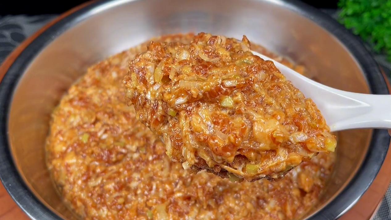 倒入泡好的料水,先把这个料水倒入一半。把肉馅抓拌均匀,让肉馅吸收所有调料和料水的味道,一直顺着一个方向搅拌,充分的把这个料水打拌到肉馅里面。