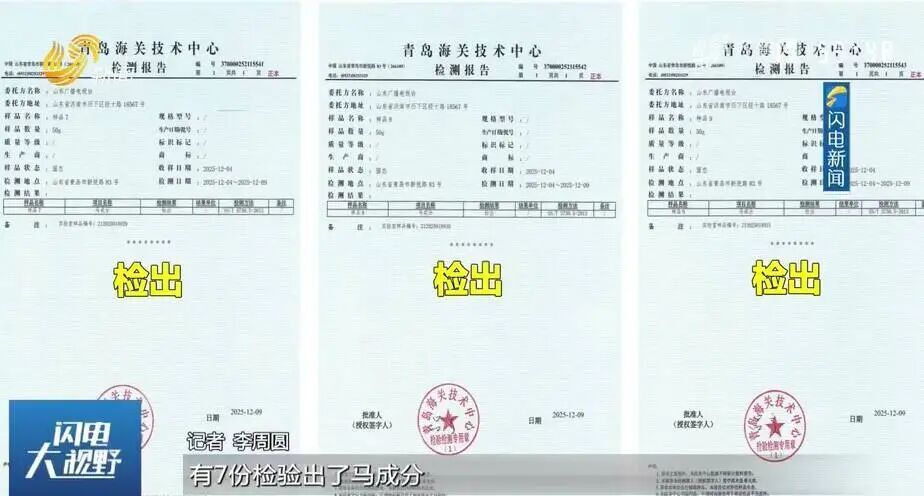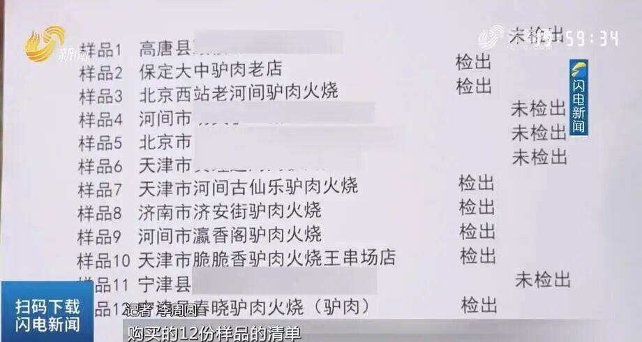 记者介绍:“这是我们从7个城市购买的12份样品的清单。样品的来源城市主要包括山东的济南、高唐、宁津,北京、天津以及河北的河间和保定。经过一段时间的等待,现在检测结果已经全部出来了。通过检测我们发现,12份样品中有7份检测出马成分,检出率大约为58%。”