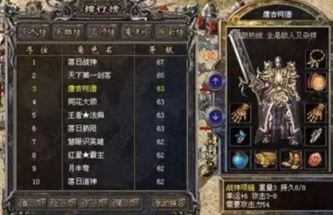 第三位:低调王者 —— 落日骄阳(落日战神)!和唐吉柯德同服的这位大佬,才是真正的 “低调猛人”:唐吉柯德有的神装他全有,唐吉柯德没有的,他还能拿出绝版货!比如防 8 魔御 5 攻 5 道 1 的黑铁头盔、全服独一份的准 3 攻 9 夏普儿手镯,每一件都是传说级装备。更狠的是,早期他玩战道组合觉得不顺手,直接放弃服务器前十的 “落日骄阳” 账号,重新注册 “落日战神” 玩战战组合,一路氪金冲到全服第一,这份魄力和实力,配得上 “钱财乃身外之物” 的终极境界!