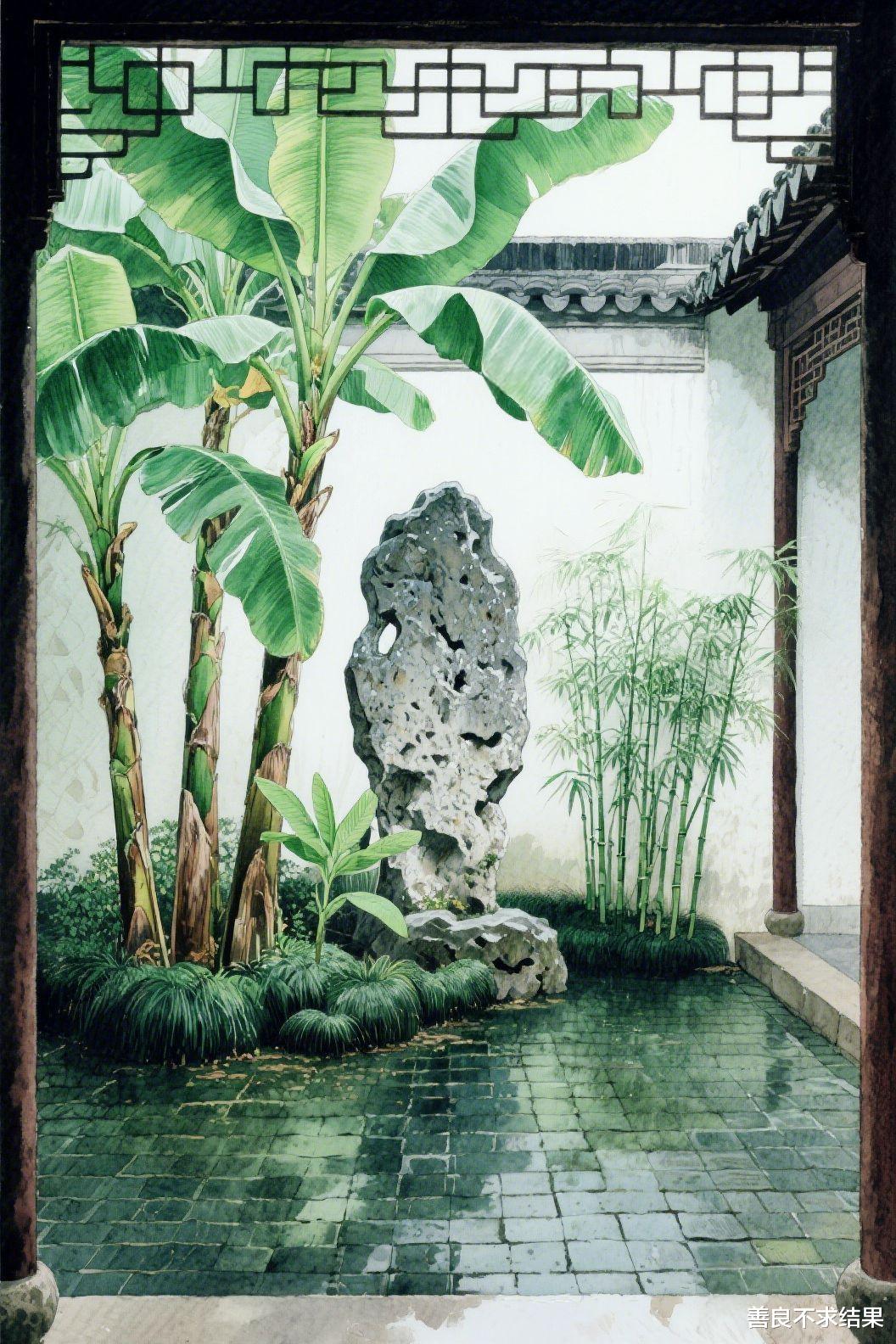 芭蕉还可以作为“软隔断”,出现在古今庭院之中,是中式庭院造景的的“层次大师”。明代沈周《蕉石图》,以蕉配石、留白造势,尽显江南庭院的婉约,告诉我们小户型种芭蕉,要 “少而精”,以景衬情。