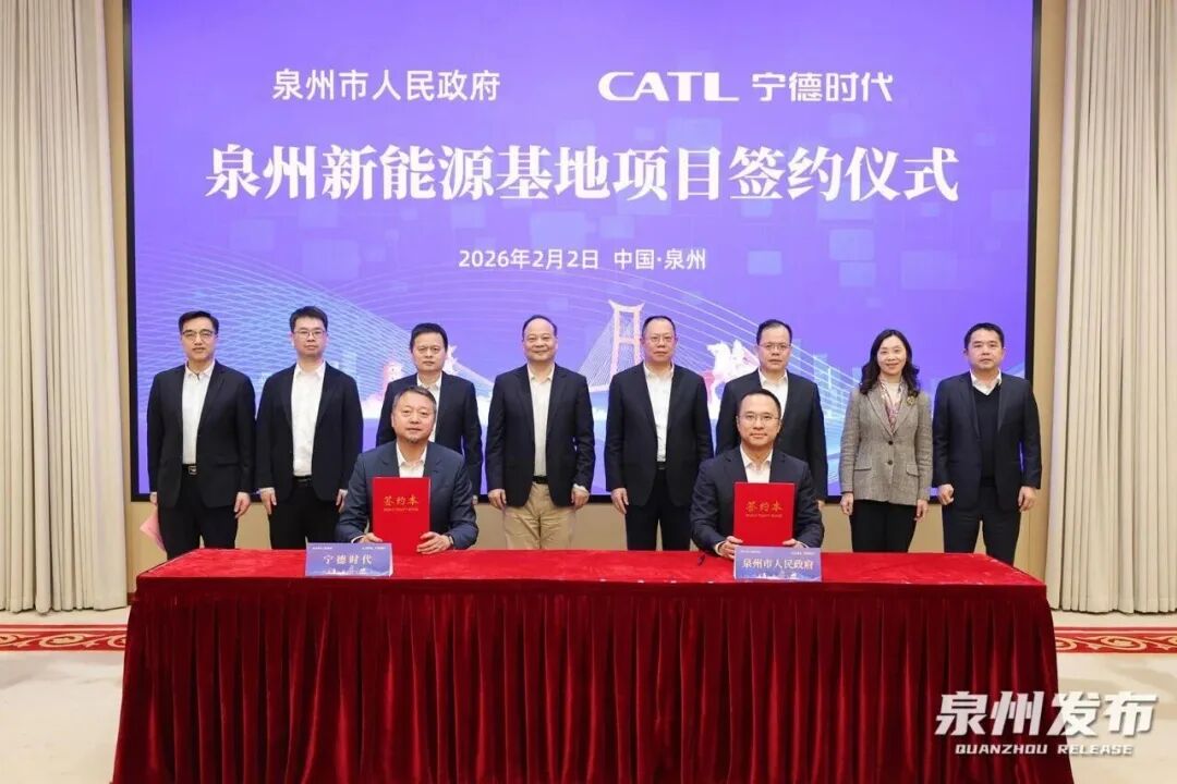 2月2日,泉州市人民政府与宁德时代正式签署新能源电池生产基地项目合作协议。根据合作协议,泉州市与宁德时代将围绕新能源电池的研发与制造开展深度合作,运用先进绿色制造技术,建设智能化、零碳化现代工厂,完善产业链配套,带动上下游企业协同发展,共同壮大新能源产业生态。