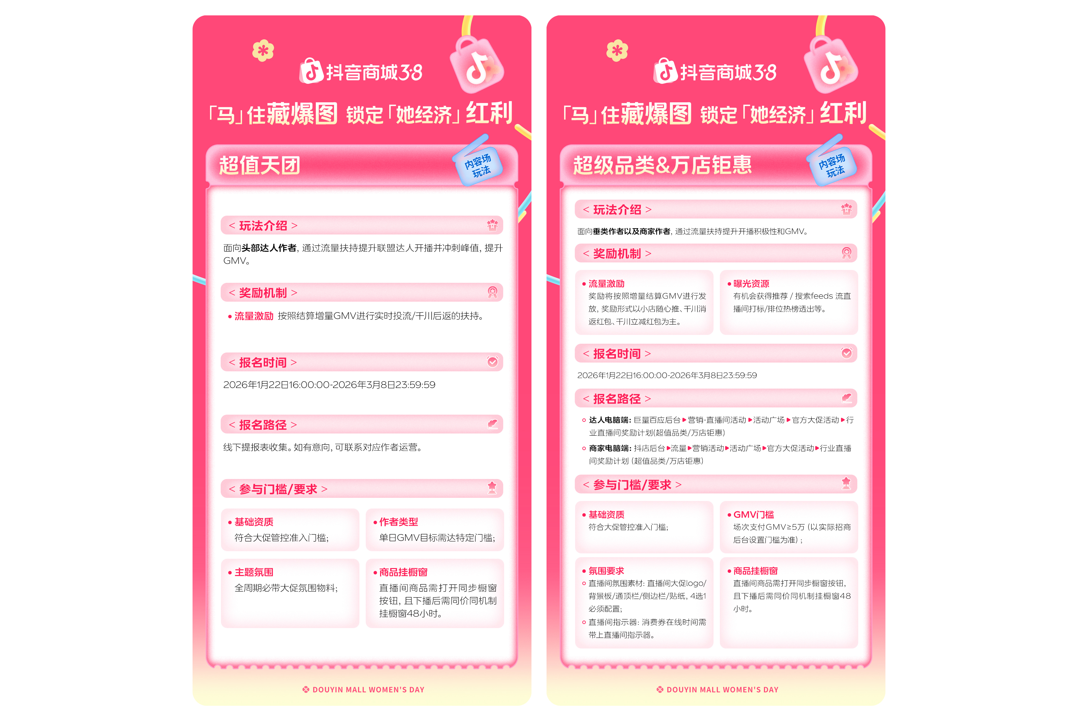 精准洞察悦己与礼赠的消费趋势,叠加节后复工、开学季及春季上新的多重热度,抖音商城38好物节已成为品牌不容错过的年度交易高峰。回顾去年,抖音商城38好物节便以GMV同比增长62%的成绩,有力印证了“她经济”的强劲势能。今年,平台通过激励政策与经营工具的全面迭代,助力商家凭借价格竞争力与全域经营优势,抢跑春季焕新窗口,锁定生意的确定性增长。3月4日,抖音商城38好物节将正式开启,快速报名锁定春节后第一波生意红利!