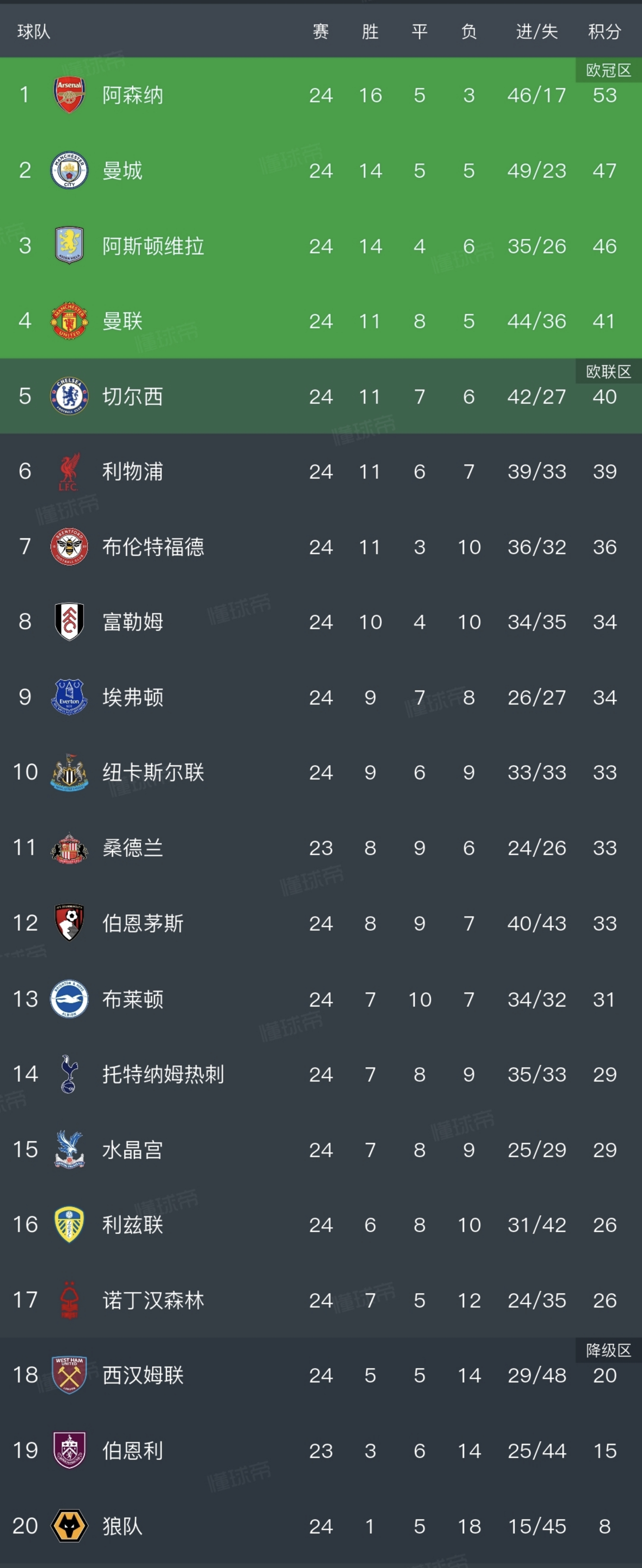 几场比赛过后,英超积分榜也有了新的变化。阿森纳稳居榜首,以6分的优势领跑积分榜。而本轮平局收场的曼城和遗憾告负的阿斯顿维拉,则被进一步拉大分差,隐隐有掉队趋势。曼联则反超切尔西,上升到了第四。再往后则是利物浦和布伦特福德等队。