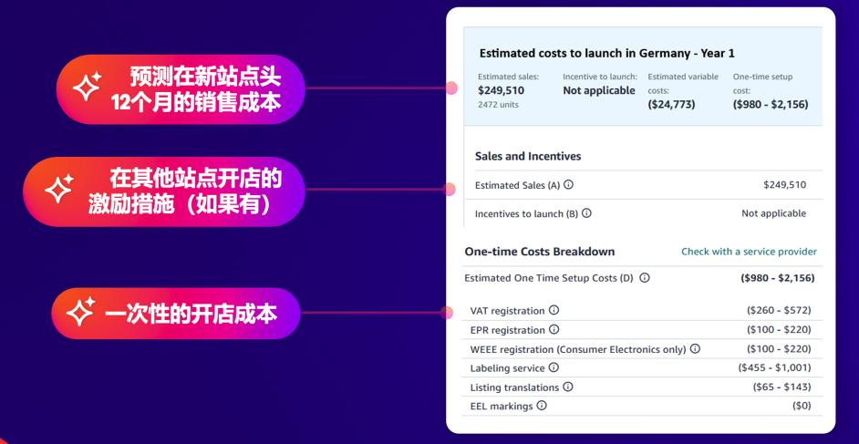 详细列出一次性成本(VAT 注册、EPR 注册等)和年度成本(物流、税费等),明确账户和产品层面的合规要求;此外,还会为卖家提供推荐的服务商列表,他们能够帮助您在目标站点建立业务和产品目录