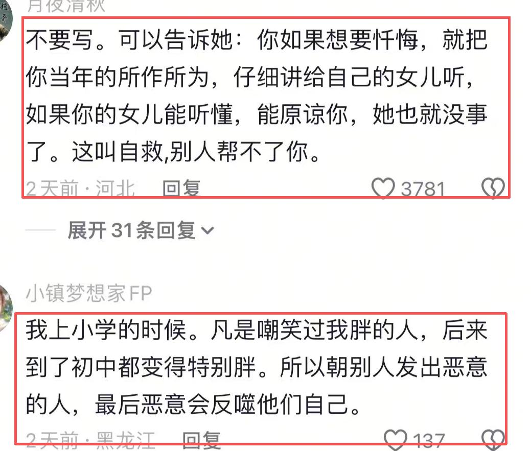 有网友说:“我算看明白了,她直到现在还在霸凌你。”