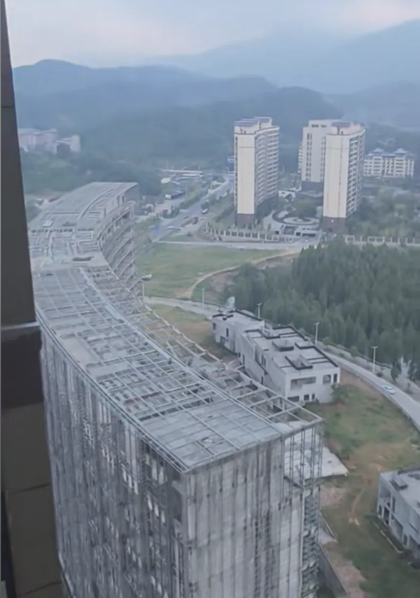 它原本规划为五星级温泉度假酒店,如今却只是裸露的钢筋混凝土骨架,被脚手架层层包裹,在日晒雨淋中默然褪色。楼底荒草蔓生,几乎齐腰,与周围整洁的现代住宅小区形成刺眼对比。