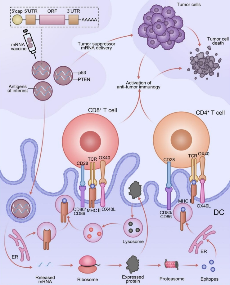 👉mRNA疫苗的分子设计:选定新抗原序列后,将其编码核酸整合至mRNA分子中。现代设计策略包括:优化密码子以增强翻译效率;引入非复制型信使RNA结构,确保高稳定性与安全性;在序列两端添加必要的非翻译区以调控表达;并采用共同递送策略,将多个新抗原序列编码于单一或混合mRNA分子中。