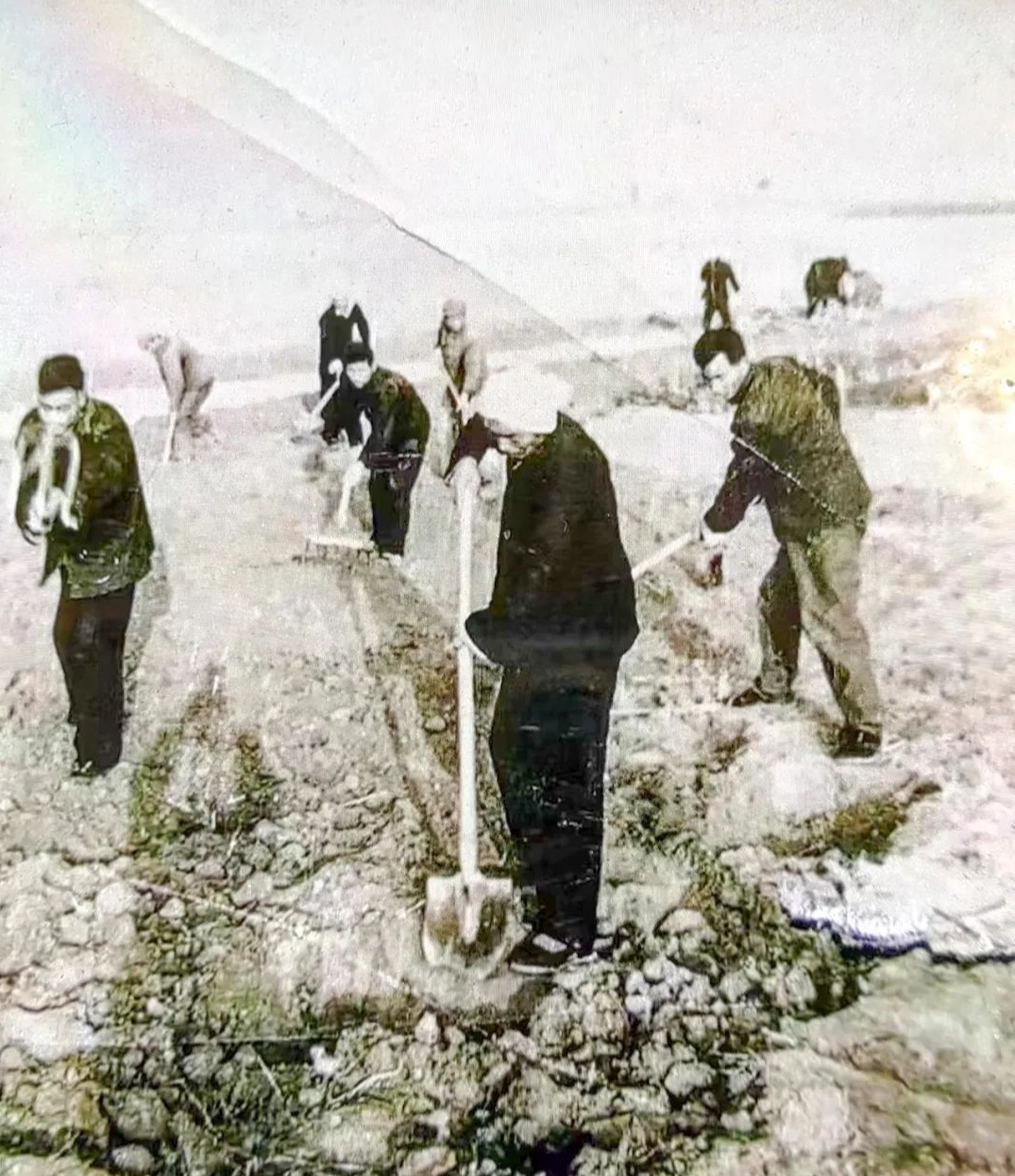 苗庄村大队领导班子在田间劳动 中:苗德祥 左:苗国富 右:苗永顺