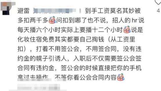类似的还有到手的工资被扣两千多,问扣到哪了,也不说,每天实际播12小时,结果化妆住宿全部自己掏钱……