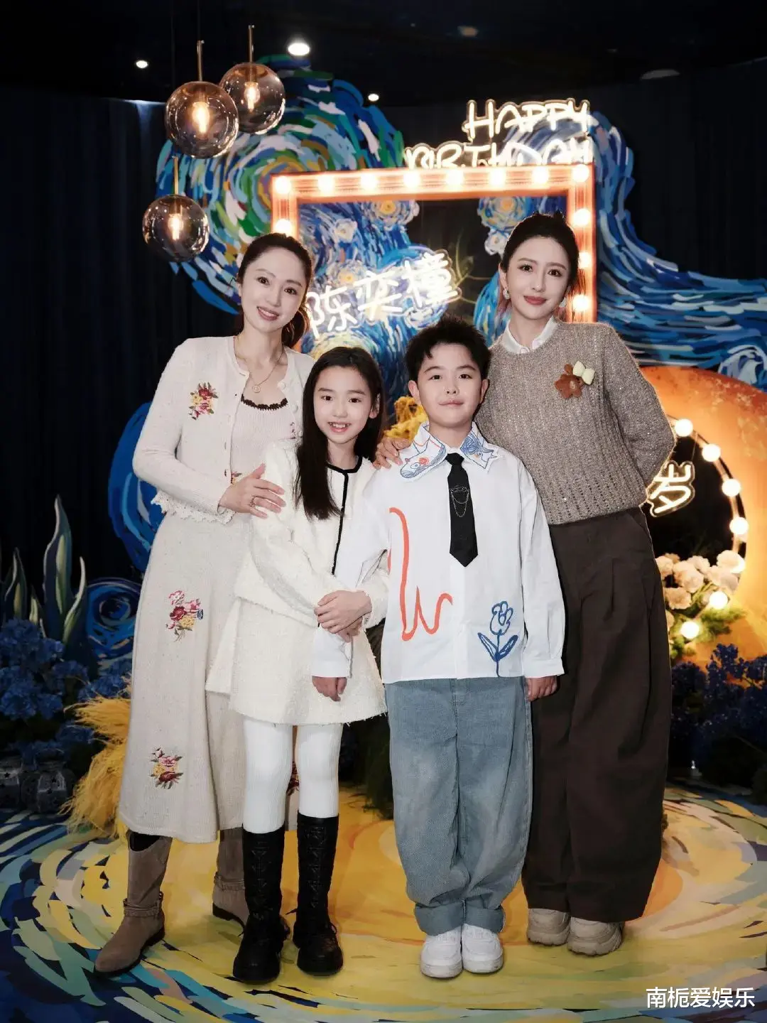 高潮出现在五人同框的“全家福式”合影。佟丽娅、陈思诚、朵朵、董璇与女儿小酒窝一起合影,站姿自然,笑容真挚。董璇次日晒出十年前怀抱婴儿朵朵的旧照,配文“一转眼就长大啦”。原来,两家人的羁绊早已超越婚姻关系:董璇是佟丽娅20年挚友,曾全程陪产;两个孩子自幼儿园起便是同班同学,亲密如兄妹,被网友称为“现实版青梅竹马”。