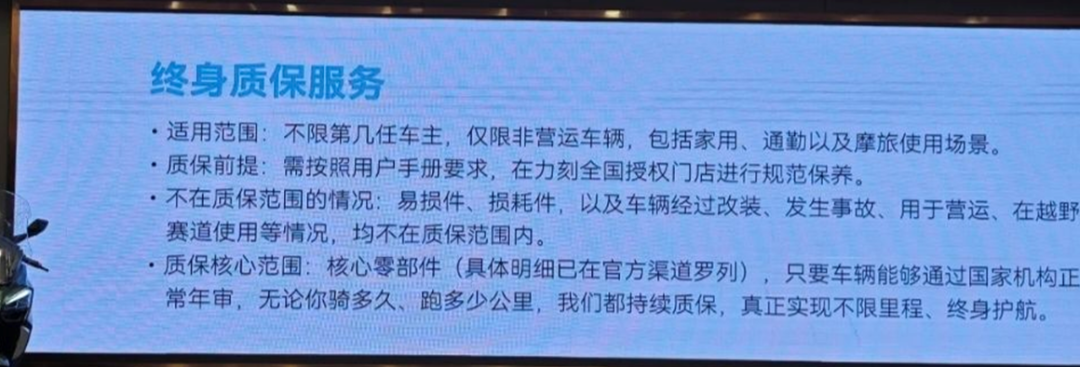 跟汽车行业常见的3年10万公里质保不一样,摩托车领域之前最长的质保周期就只有5年,力刻把这个标准提高到接近13年的行业新高度, 这不仅是对产品质量有自信的表现