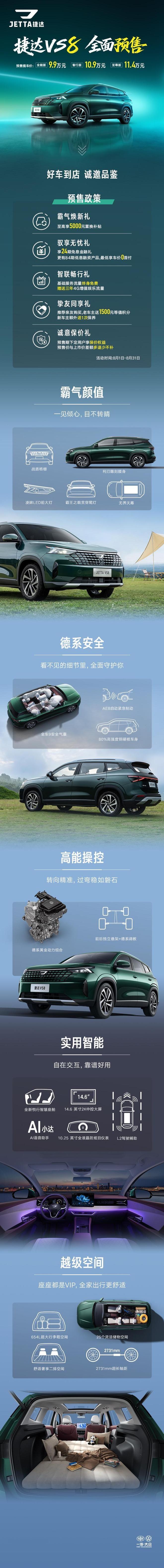 2025年8月8日,一汽-大众旗下捷达品牌宣布,其全新中型SUV — 捷达VS8正式开启预售。新车共推出全能版、智行版和至尊版三款车型,预售价格区间为9.9-11.4万元。作为捷达品牌战略升级的最新力作,VS8凭借纯正德系基因、智能科技配置、越级空间表现及诚意价格,成为家庭出行的可靠之选。
