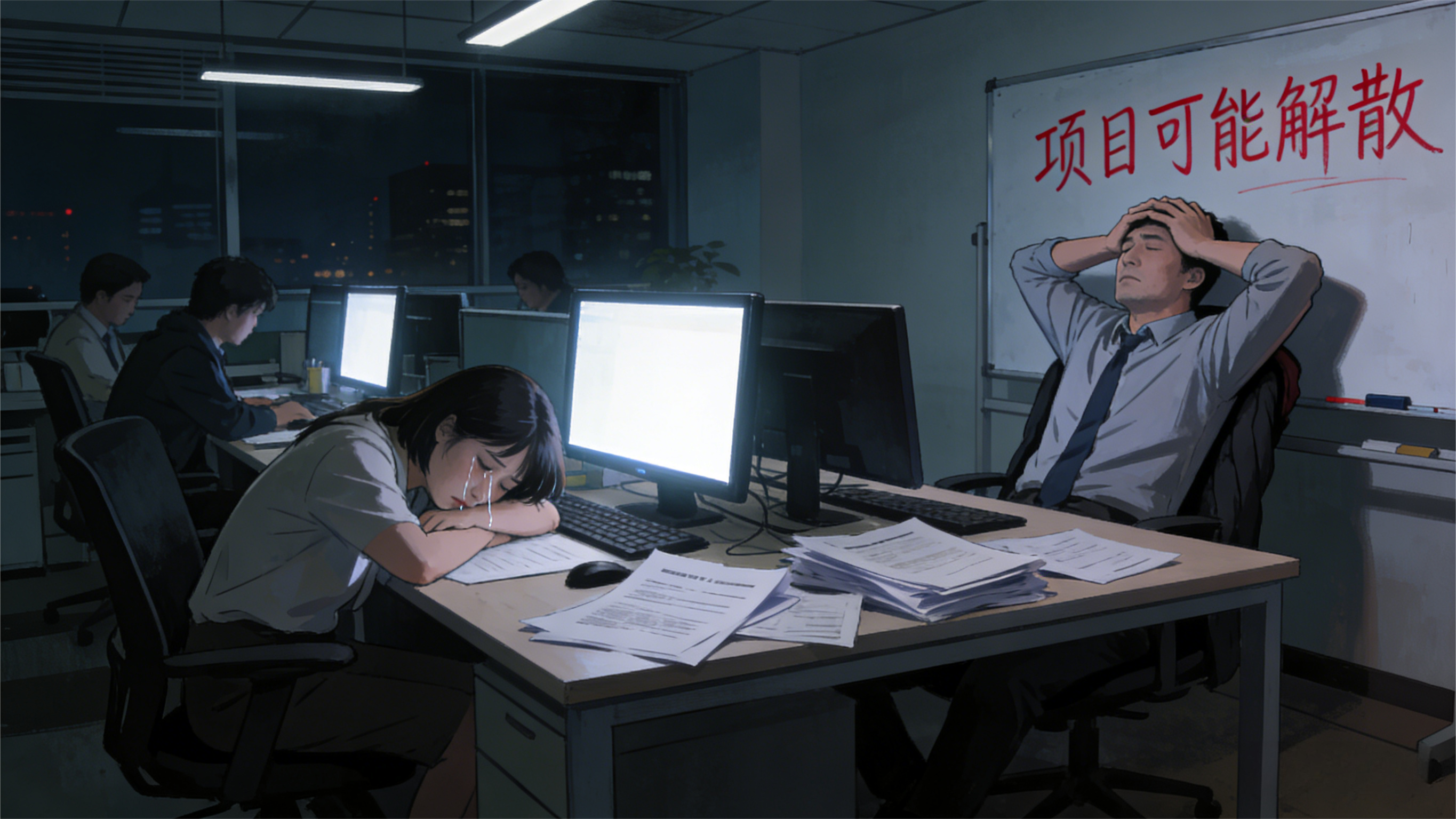 那天晚上,团队所有人都留在办公室加班,没人说话,气氛压抑得让人喘不过气。实习生小周偷偷抹眼泪,说 “刚毕业就失业,不知道该怎么办”;老员工老王叹了口气,说 “上有老下有小,真不敢失业”。我看着他们疲惫又无助的模样,突然想起当初大家跟着我一起接手项目时的期待,心里像压了一块石头。