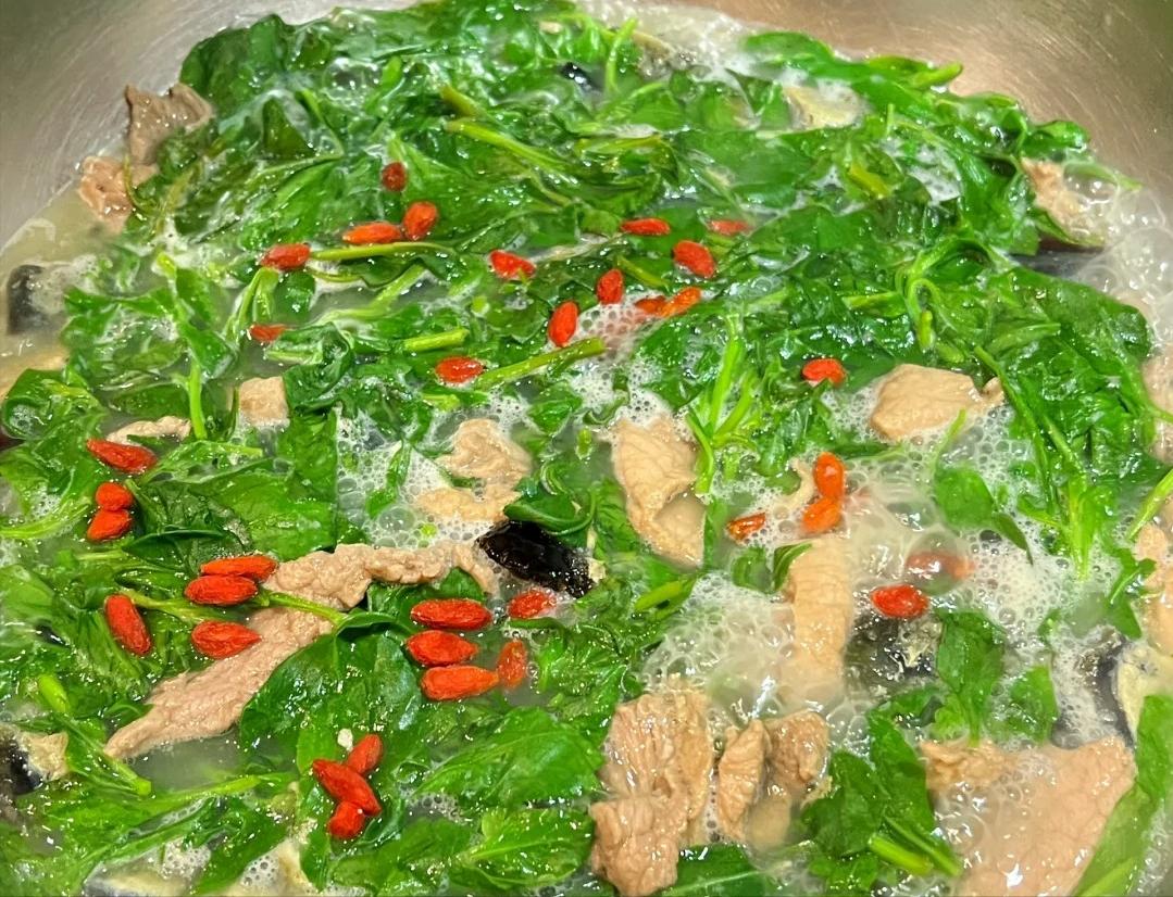 3、等水开得差不多了,把腌好的瘦肉放进去,煮到八分熟,这时候的肉就像刚睡醒的娃娃,软乎乎的。然后把枸杞芽也丢进锅里,枸杞芽就像一群小绿精灵,在锅里欢快地跳舞。等汤再次煮开,就可以撒点盐调调味啦。